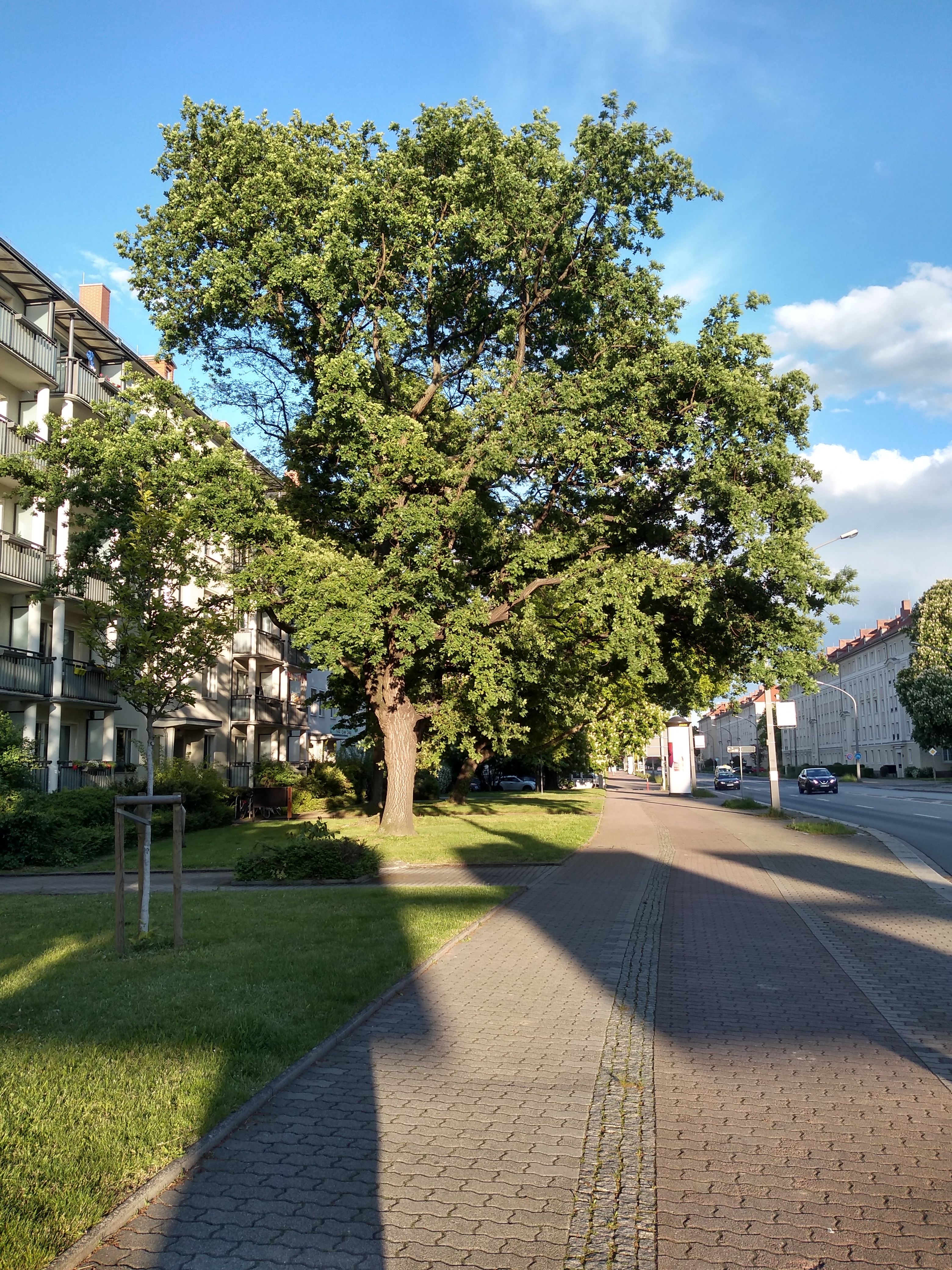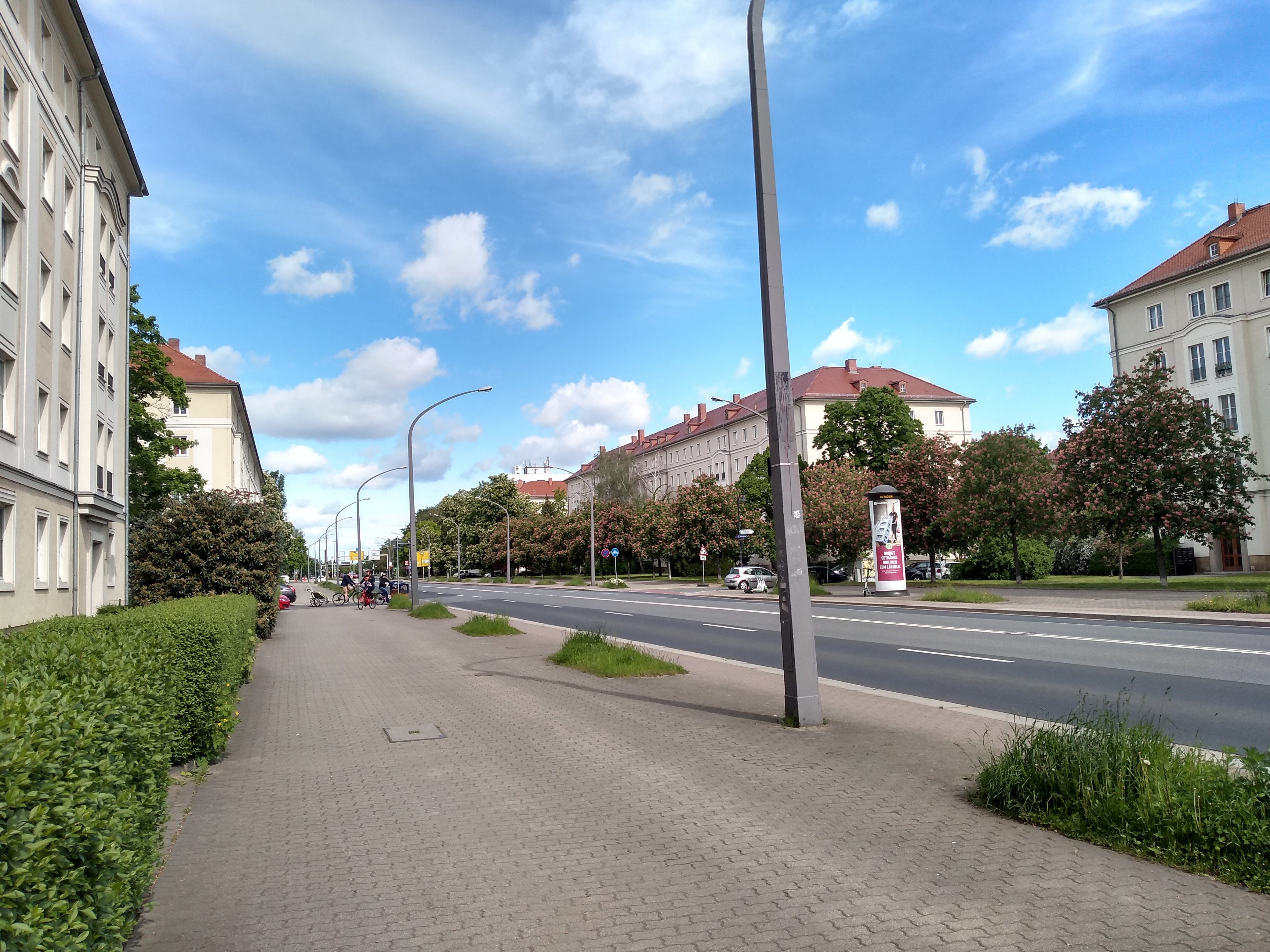 Dieses Gleisbett mit einer Breite von 6,65m soll in der Mitte der weiterhin vierspurigen Straße liegen. Dieses soll noch beidseitig von einem 3m breiten Grünstreifen flankiert werden, welcher abschnittsweise auch als Abbiegespur oder Busspur fungiert. Diese Streifen sollen auch mit Bäumen bepflanzt werden. Aufgrund des geringen Platzes eingepfercht zwischen Gleisbett und Straße dürfte diese Pflanzung aber relativ sinnfrei sein. Sollten sie, wider Erwarten doch groß werden, müssten sie wieder gefällt werden, denn sie würden in Konflikt mit den Oberleitungen der Straßenbahn geraten und ihr Laub auf die Straße abwerfen. In dem zu beiden Seiten hin verdichteten Boden kann sich auch das Wurzelwerk nicht entfalten und die Bäume würden ab einer bestimmten Größe an Wassermangel eingehen. Nur um sich das einmal vorzustellen: die gesamte Fahrbahn, inklusive der Straßenbahntrasse und den angrenzenden Seitenstreifen in der Mitte der jeweils 2 Fahrspuren, wäre dann etwa doppelt so breit wie jetzt! Die Radwege sollen beidseitig auf 1,80m (derzeit 1,10m - 1,50m) verbreitert werden. Hinzu kommen noch Gehwege von 4,50m Breite (derzeit ca. 6,50m - 6,70m) und Haltestellen. Im Zuge dessen soll der jetzige Grünstreifen, welcher in Richtung Nossener Brücke auf der rechten Seite liegt, etwa um die Hälfte reduziert werden. Sämtliche Gehölze, die jetzt dort stehen, sowie z.T. auch in den Einmündungen der Seitenstraßen, sollen entfallen. Im Planfeststellungsentwurf steht dazu lapidar: